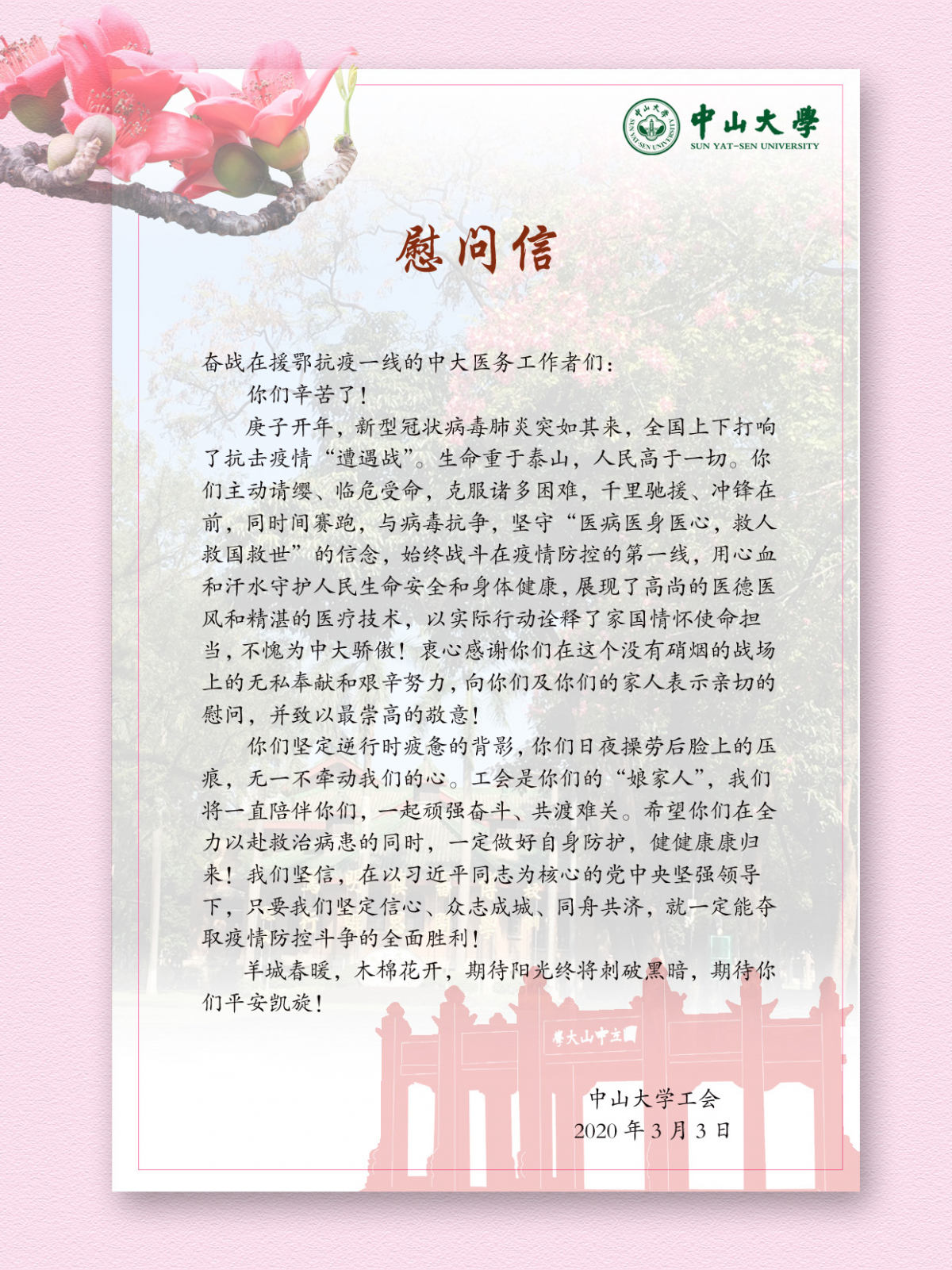 自新型冠状病毒肺炎疫情爆发以来,校工会积极行动,紧急划拨专项经费慰问我校三家新冠肺炎定点诊治和疑似病例收治医院,并为奋战在援鄂一线的医护人员送上慰问信和慰问金。