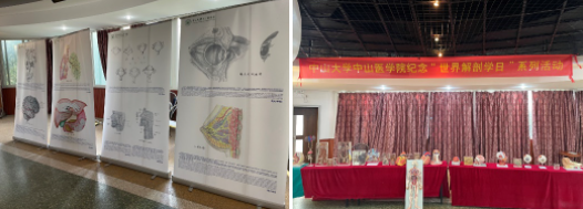 为保障科普活动质量及活动的顺利进行,中山医学院的同学们早早地来到现场布置。场边展示的标本以及模型是北校园科技楼的藏品,是医学生们平时学习人体解剖知识的重要工具,能让大家更清晰和直观地认识到人体器官的分布和形态特点。除了各式各样的模型之外,场边的海报架为大家展示了大量手绘解剖图,这些精美的解剖图都是由我校的医学生根据所学知识,并融合自己的创意亲手绘制而成。绘制解剖图能够帮助我们把人体每个结构的知识点内化成为长期记忆,是学习解剖学重要方法之一。