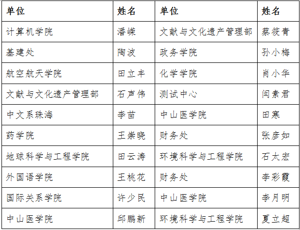 微电子科学与技术学院、文献与文化遗产管理部、化学工程与技术学院、材料学院、测绘科学与技术学院、药学院、岭南学院、中法核工程技术学院、生命科学学院、社会学与人类学学院、审计处、国际金融学院、旅游学院、测试中心、地球科学与工程学院、计算机学院、公共卫生学院、海洋科学学院、外国语学院、大气科学学院。