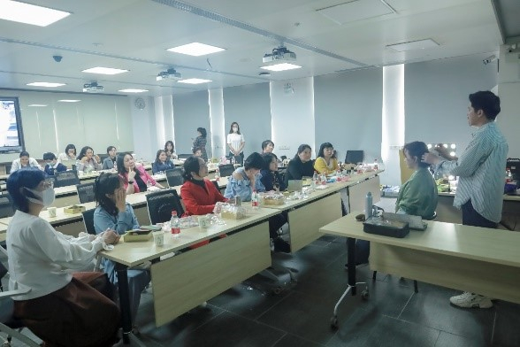在个人形象与美妆培训环节,化妆师和发型师的细心讲解示范下,大家边学习边操作,用心体会美妆技巧,现场气氛活跃,洋溢欢声笑语。老师们表示,通过相关培训,提高技能,加强观察美、发现美、感受美、表现美的水平。