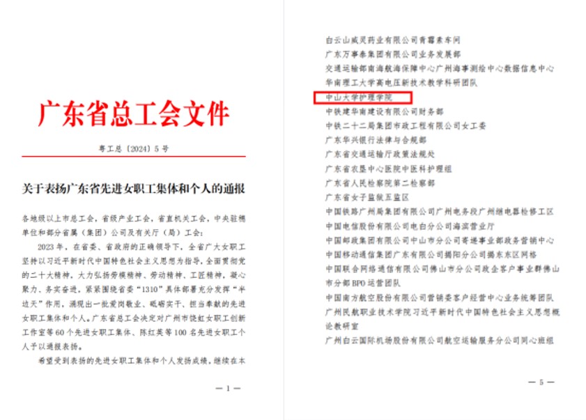 近日,广东省总工会印发《关于表扬广东省先进女职工集体和个人的通报》,表彰了一批广东省先进女职工集体和个人,yl23455永利集团护理学院获评广东省先进女职工集体。