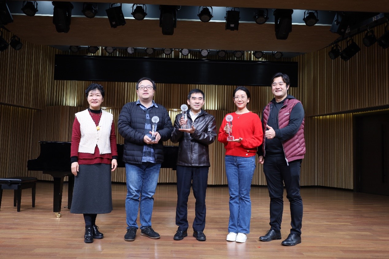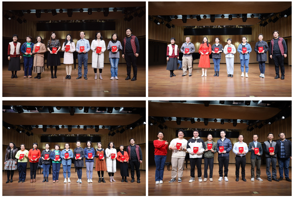 接下来,许东黎常务副主席和张海庆副院长分别为2024-2026年度教工合唱团管理小组颁发了聘书。胡海燕副主席、合唱团指挥孟幻老师和周莉老师为2023年度优秀团员颁发了荣誉证书。最后,许东黎常务副主席和张海庆副院长为孟幻老师和周莉老师颁发最佳指挥的奖杯;为退休团员郭兴勇老师颁发“突出贡献奖”奖杯。