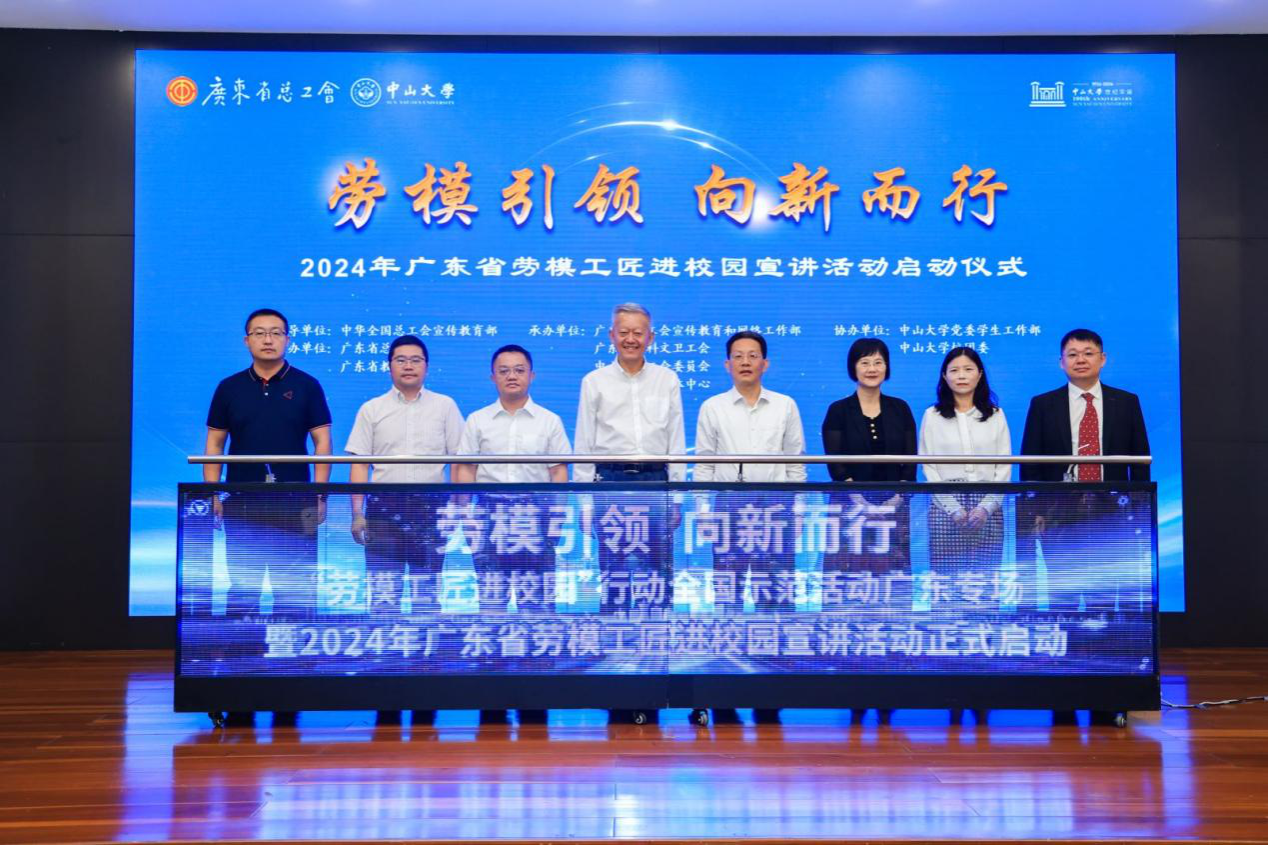 活动伊始,陈春声、陈伟东、冯建华、吴艳玲、彭波与3位劳模工匠代表共同启动2024年广东省劳模工匠进校园宣讲活动。
