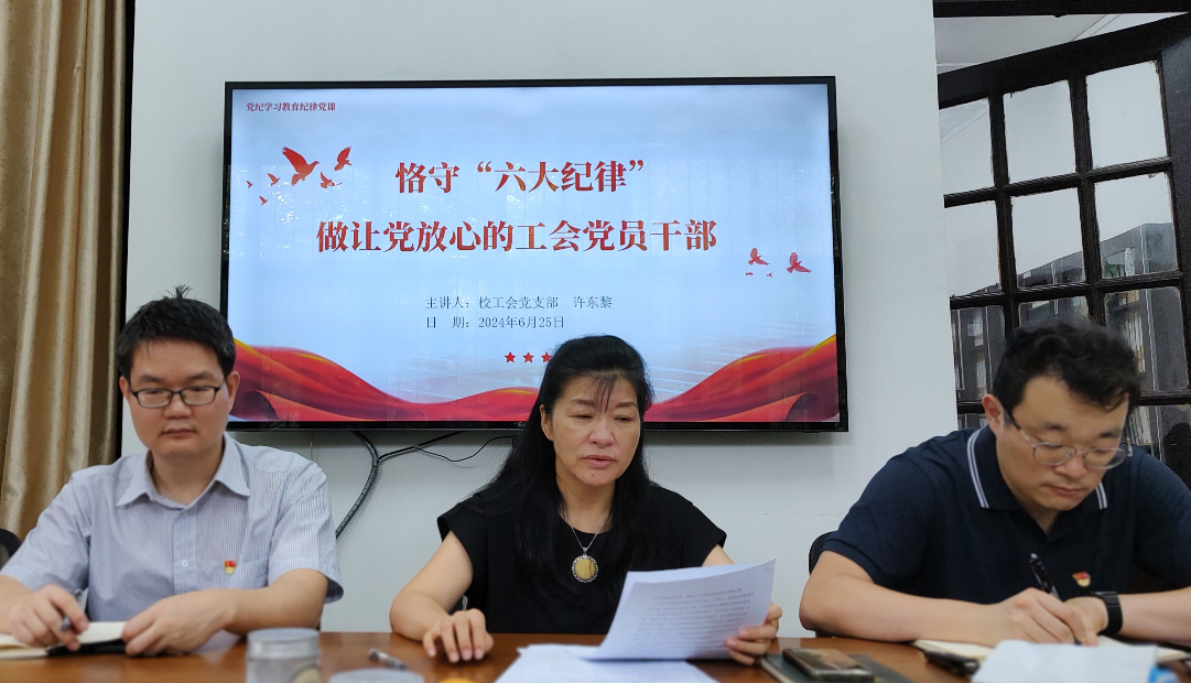 6月25日下午,校工会党支部在工会二楼会议室开展党纪学习教育第三次集体学习暨6月组织生活。会议由支部书记许东黎同志主持,校工会全体党员和同事参加了会议。       校工会党支部严格贯彻落实学校党委、机关党委的通知要求,把开展党纪学习教育作为重要政治任务,统筹并加强督促落实全体党员的党纪学习教育,结合实际开展多种形式警示教育。1.讲好党纪学习教育纪律党课         根据党纪学习教育工作要求,许东黎同志作题为《恪守“六大纪律” 做让党放心的工会党员干部》的党纪学习教育专题报告。许东黎同志详细阐述了“六大纪律”的具体内容并结合工会工作实际,深入浅出地解读了政治纪律、组织纪律、廉洁纪律、群众纪律、工作纪律和生活纪律的内涵和要求。她通过违纪违法案例“活教材”,以案促学、以训助学,告诫全体党员要把党纪学习教育融入日常、抓在经常;通过党纪教育与工会实际工作相结合,并加以剖析,教育引导党员干部学纪、知纪、明纪、守纪,进一步强化纪律意识,让党纪学习教育入脑入心,让党员干部受警醒、明底线、知敬畏。