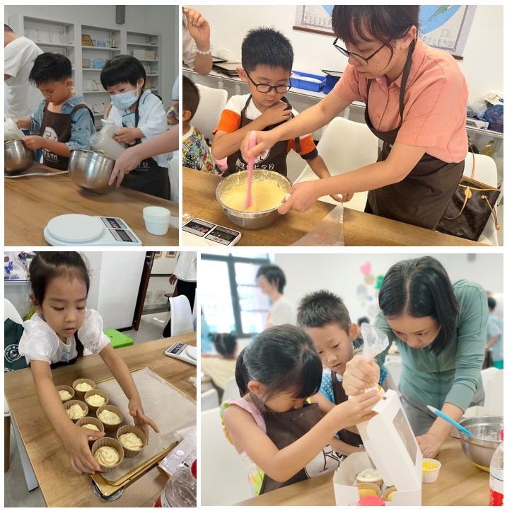 活动现场洋溢着欢声笑语,孩子们都对这次的烘焙活动抱有较高的热情和期待。首先,大家通过观看烘焙师的规范操作,学习烘焙基础知识和纸杯蛋糕的制作程序。接下来,各组家庭分领好材料,正式开始制作。大家在烘焙师的指导下,分步骤、按分量加入食材搅拌均匀,然后将面糊挤入纸杯中放进烤箱烘烤。待烤熟冷却后,小朋友们充分发挥自己的想象力和创造力,使用奶油、水果、饼干等原料装饰自己的纸杯蛋糕。活动最后,每个家庭都收获了独一无二的成品。家庭共同制作的过程,既锻炼了每个小朋友的动手能力,使他们体验到了作为“小小烘焙师”的成就感,又让各个家庭充分体验到手工制作的乐趣,收获了美好的回忆。