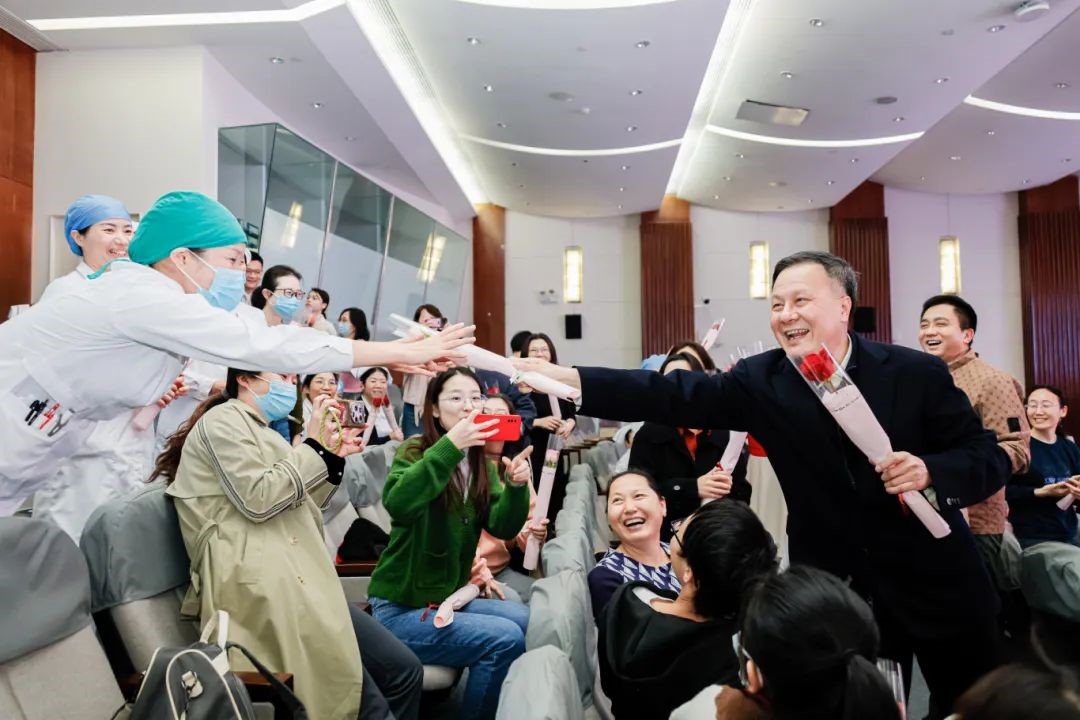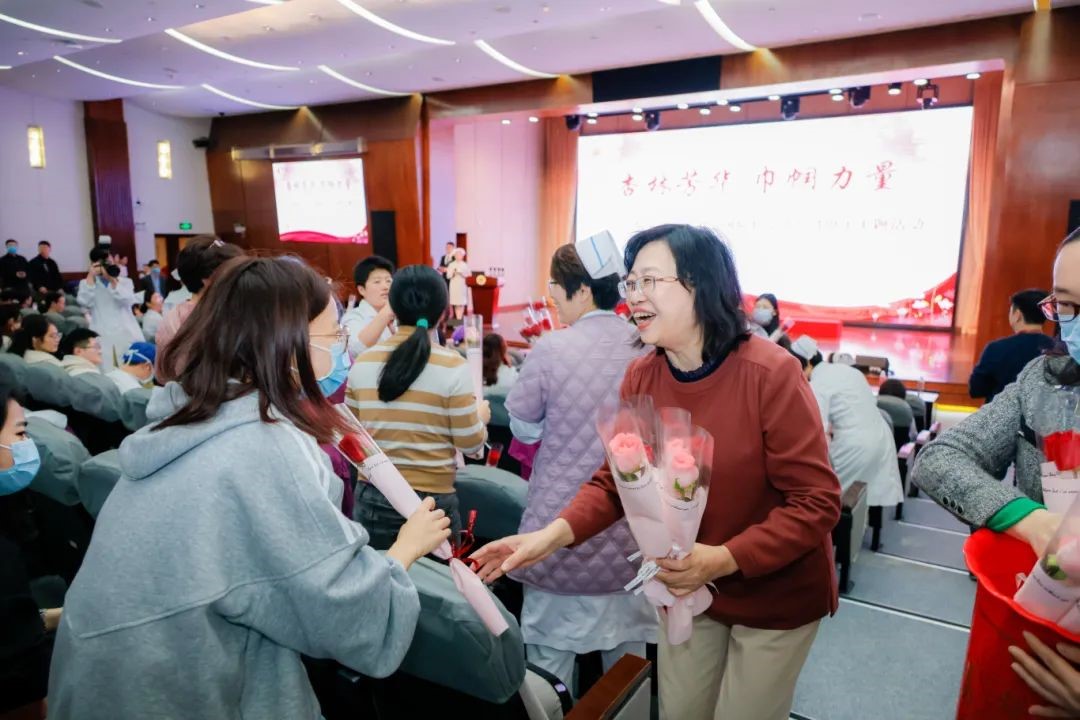此外,大会还特别融入了互动环节,康复医学科治疗师为女职工们设计编排了一套健身操,并带领在场观众们集体锻炼,现场气氛火热。健身操后,院领导和嘉宾热情地向现场的女职工们献上玫瑰鲜花,“花式”致敬坚韧和温柔的白衣女神。