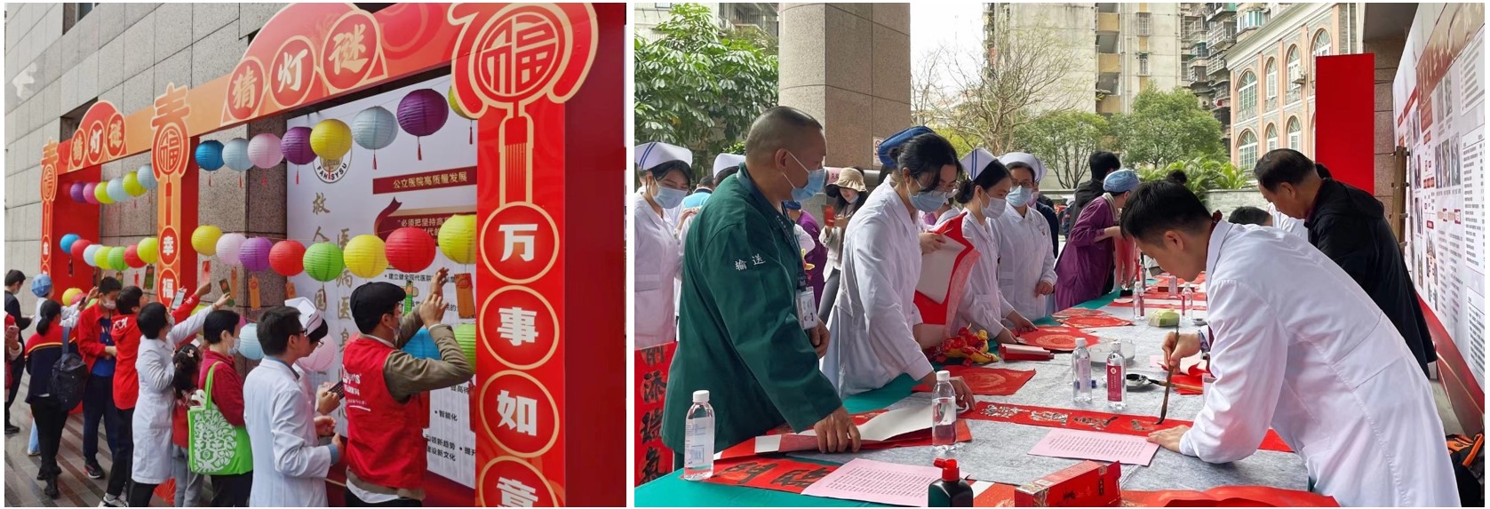 焕新2024,送福临门,工会组织迎春灯谜游园会。送福活动特邀医院书法协会陈燕奎、李悦龙、吴海肖、谭佳荣,饱蘸浓墨、提笔挥毫传递新春喜气。随着一幅幅红红火火寓意吉祥的福字和春联出炉,新春的美好祝福也随之送给了每一位兢兢业业、辛勤劳作一整年的职工。排队接福的职工络绎不绝,大家纷纷手持福字,脸上笑容洋溢,期待着春节的到来。