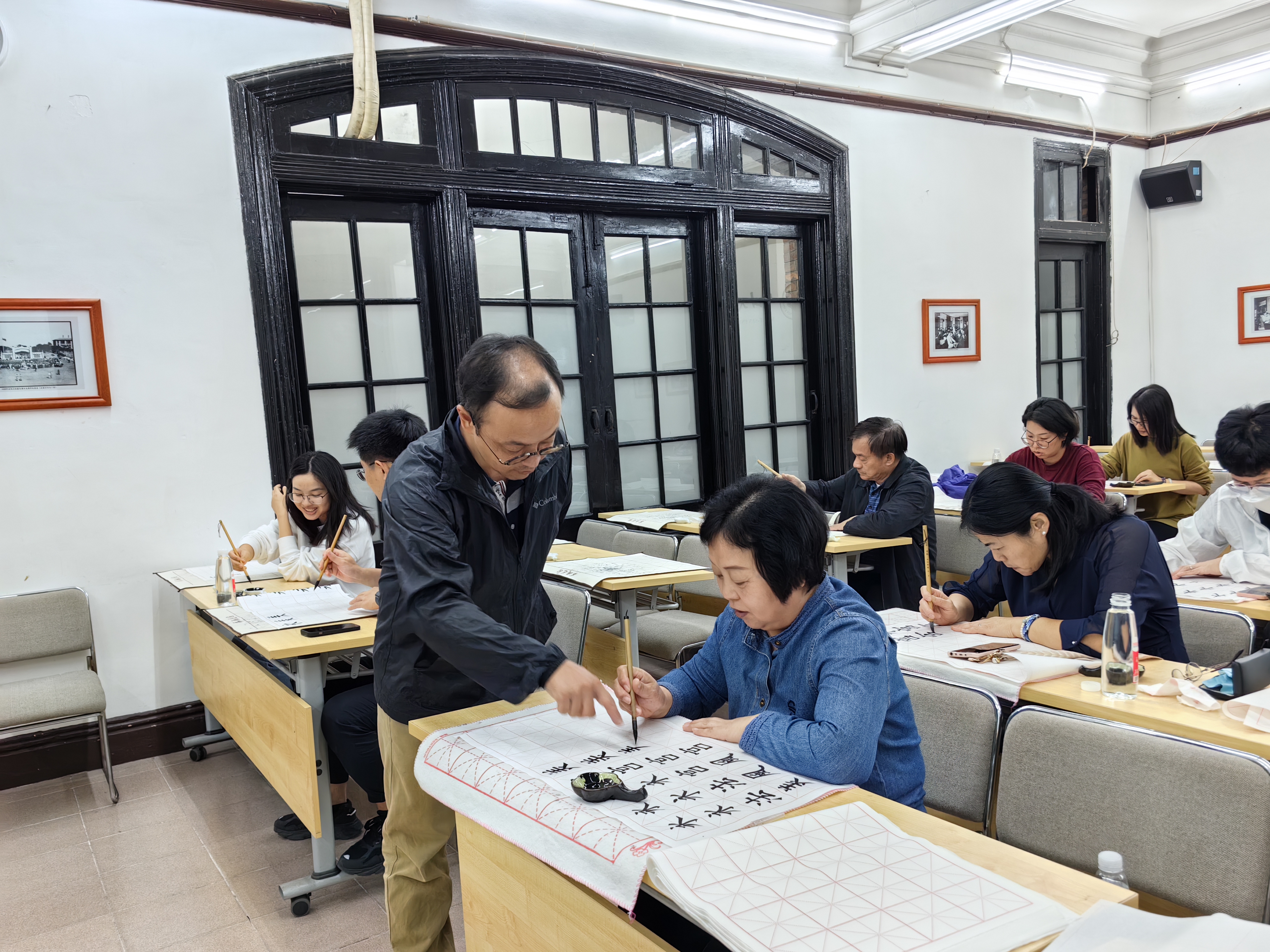 段老师指导学员写字
