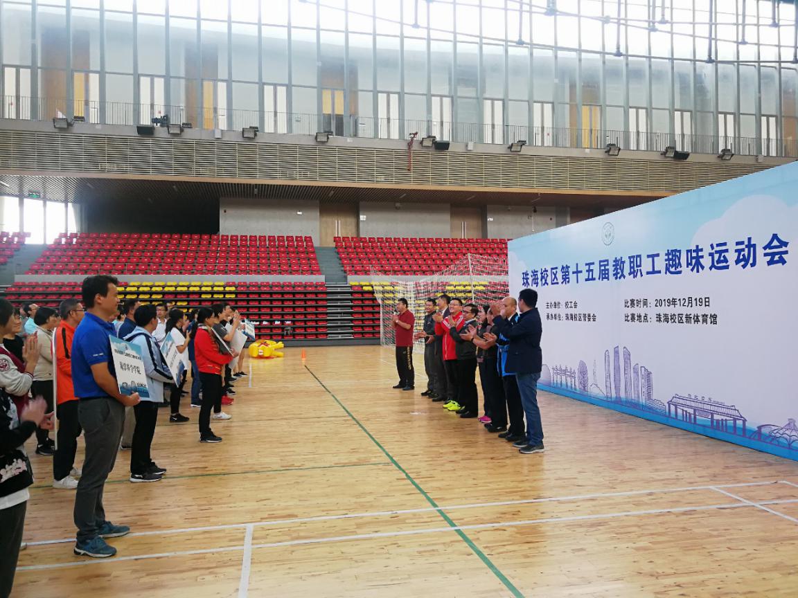 12月19日下午,由校工会主办、珠海校区管委会承办的“珠海校区第十五届教职工趣味运动会”在珠海校区新体育馆隆重举行,共有珠海校区管委会、图书馆联队、化工、物天、海工、中法核、国关、海科、大气学院及其他院系联队等10支代表队和工作人员、学生志愿者等300多师生参加了本次活动。校园发展与管理委员会冯双主任,珠海校区管委会陈有志主任,以及各有关职能部处和院系的党政领导参加了简短的开幕仪式,陈有志主任发表热情洋溢的致辞,他勉励教职工们多多参加体育锻炼,永葆健康与活力,为国家和学校的发展与建设再立新功!