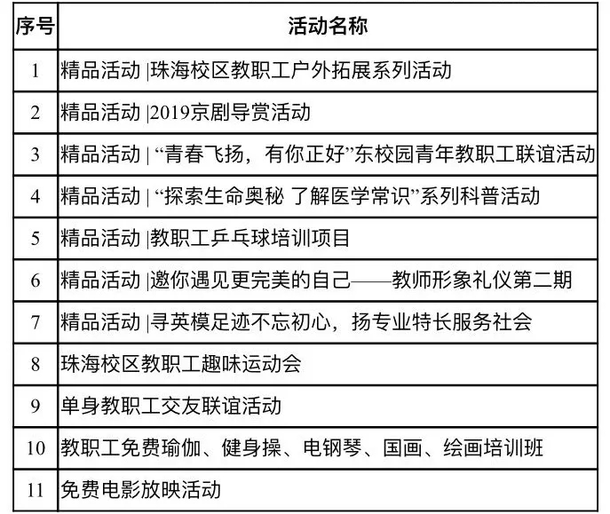 计划于年底前继续在珠海校区、北校园、东校园、举办教职工户外拓展活动,珠海校区急救培训,插花培训活动, “探索生命奥秘 了解医学常识”科普活动,“青春飞扬,有你正好”东校园青年教职工联谊活动等精品活动。