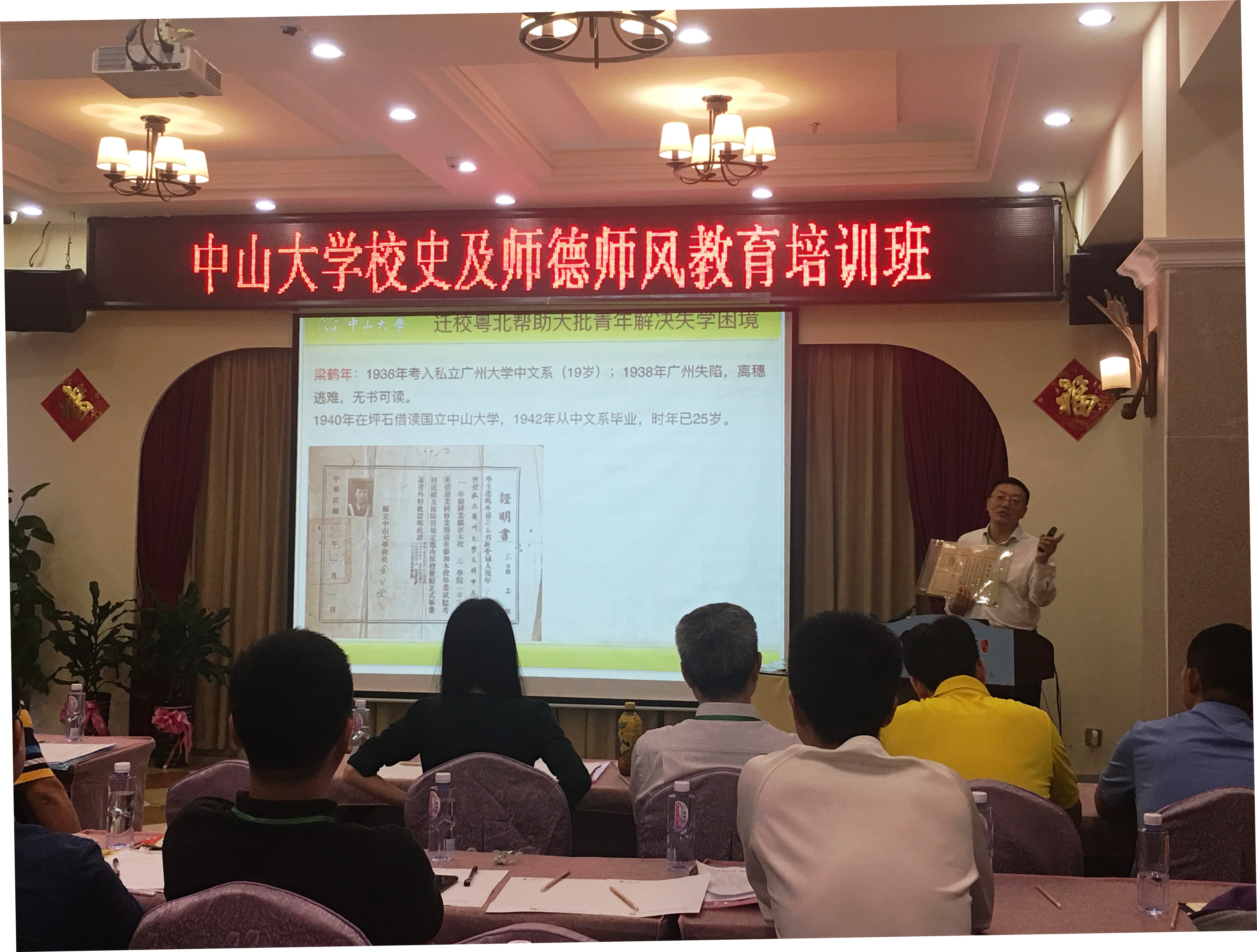 随后,校史专家、校园发展与管理委员会主任冯双老师为学员们讲述了一堂底蕴深厚的“迁校粤北”的校史课。讲座培训从中大的迁校背景,到迁往澄江、粤北,再到岭大迁校与复原石牌校园等章节,着重介绍了中大的研究生院、文学院、法学院、理学院、数学天文学院、工学院、农学院、医学院与师范学院的迁徙历程,讲述了抗日战争期间,中大各院系颠沛流离、诸多劫难、重振雄风的迁徙历史。冯双老师结合自己亲自收集的校史文献文物进行讲述,激情昂扬、内容饱满、史料丰富,始终贯穿着爱国爱党爱校的主题,深深地吸引和感染了大家。最后,他勉励大家,要有强健的体魄,要胸怀理想,脚踏实地,努力工作,爱岗敬业,知校建校,“为社会福、为邦家光”!