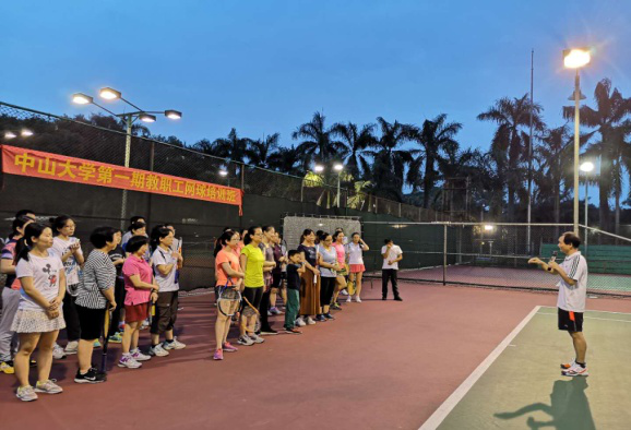 由校工会和体育部主办,教职工网球协会承办的第一期教职工网球培训班经过近2个月的认真筹备, 5月11日晚上7点,在南校园网球场顺利开班,来自我校各单位50名教职工参加了此次培训活动。本次初级培训班教授底线正手击球、底线反手击球、底线反手削球、下手发球、上手发球、底线移动步伐;提高培训班将教授底线正手击球、底线反手击球、正反手削球、上手发球、截击、高压、移动步伐、单双打比赛战术等。简短的开班仪式由校工会群工部部长汪丽老师主持,体育部党委书记凌春贤致辞,希望各位学员通过体育部各位教练精心准备的10次培训课程后,能把标准动作固定下来,重复练习,提高网球球技,以球会友,达到放松身心、强体健身的目的。本次网球培训课程由体育部陈祥慧、仇亚宾、黄志荣、周才四位老师进行授课。