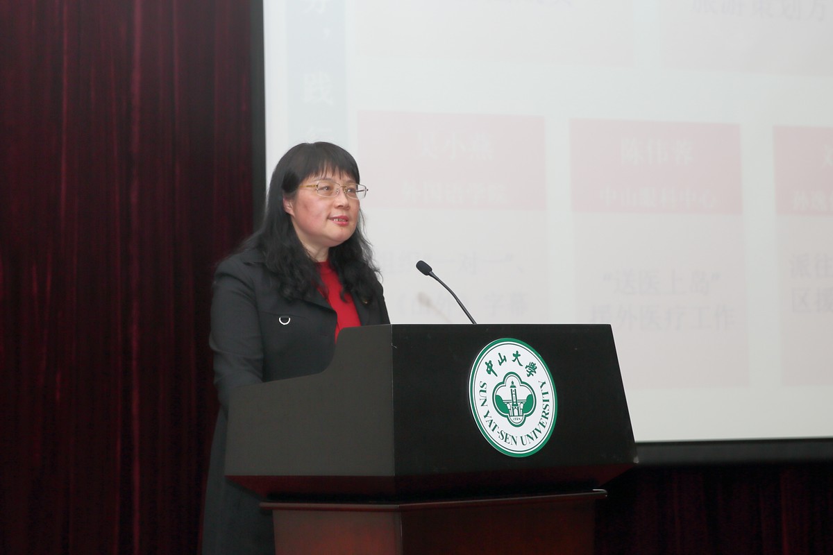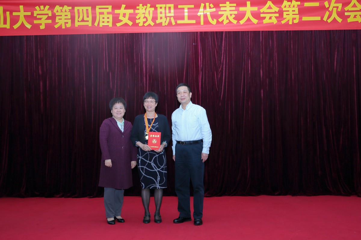 △ 校党委副书记、工会主席余敏斌,校长助理宋珊萍为荣获“广东省三八红旗手”的附属第一医院李娟教授颁发了证书和奖章