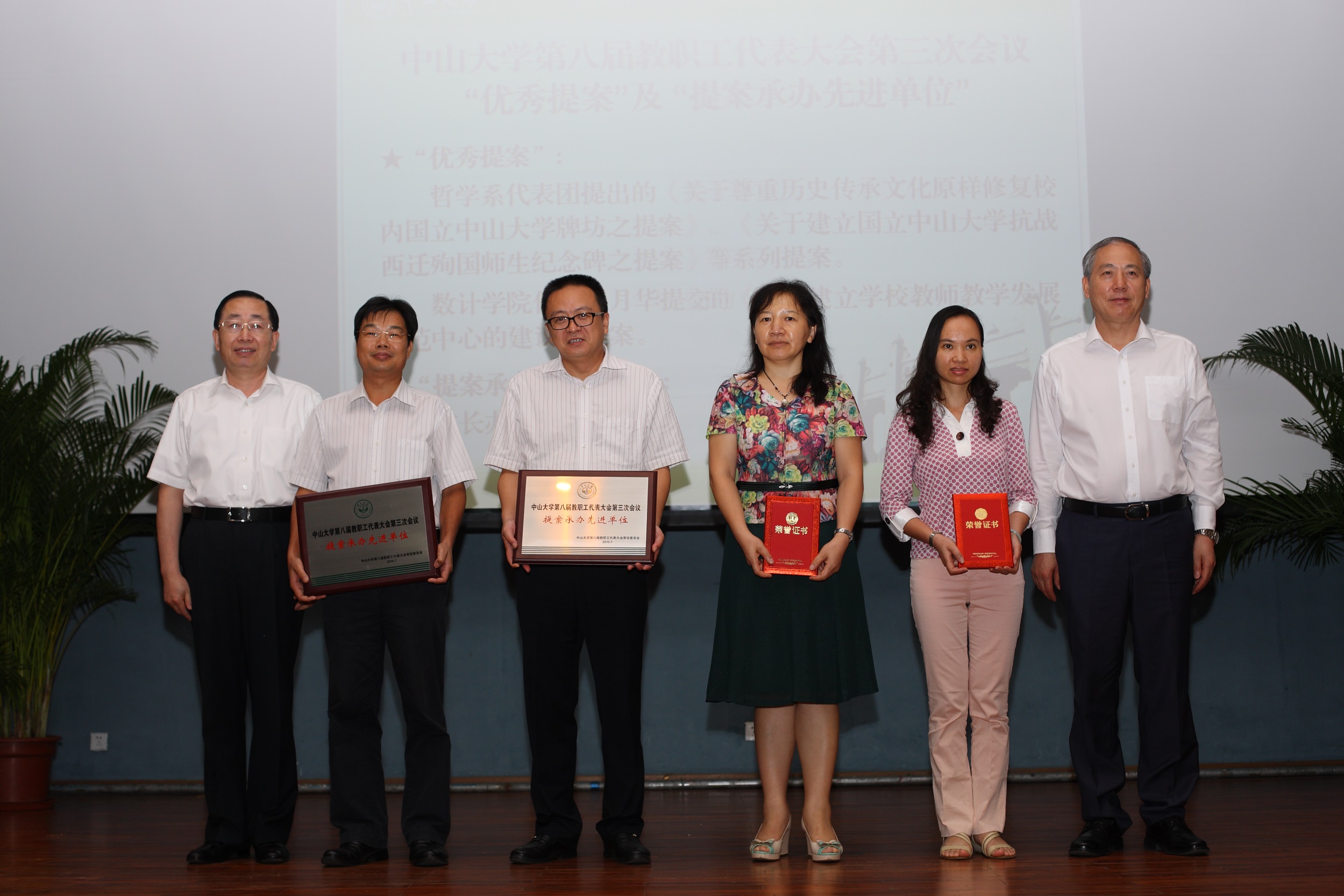 郑德涛书记(左一)、罗俊校长(右一)为荣获八届三次教代会“优秀提案奖”的哲学系教代会代表团(右二)、数计学院程月华代表(右三)和荣获“提案承办先进单位”称号的校长办公室(左三)和校基建处(左二)颁发奖牌和证书