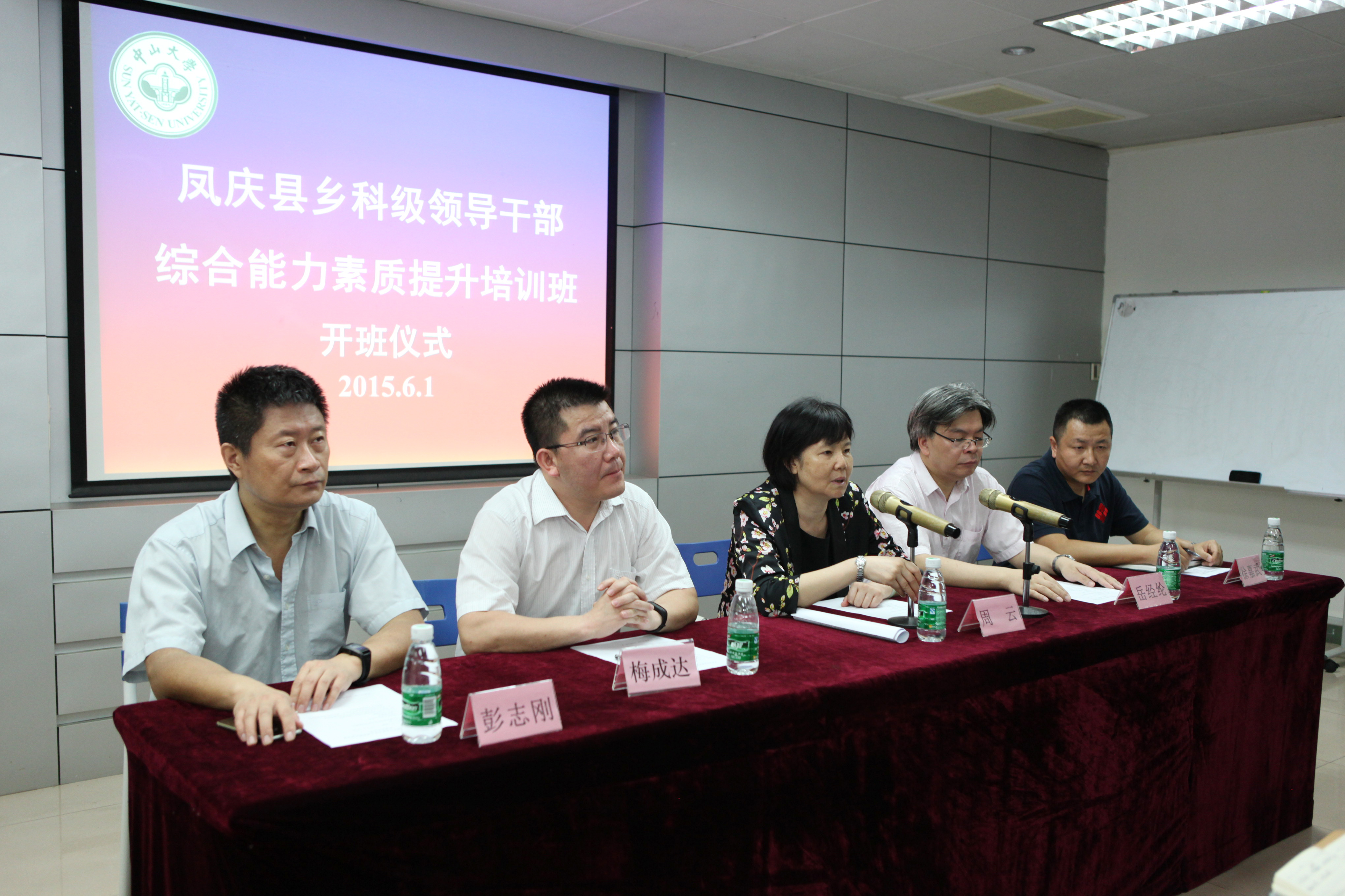2015年6月1-5日,我校对口帮扶地区云南省凤庆县50名干部来我校参加综合能力提升培训班,这是我校第三次为凤庆县政府管理干部进行培训,此次培训由政治与公共事务管理学院承办。6月1日上午,培训开班仪式在南校区冼为坚堂举行,仪式由政务学院书记梅成达主持,校工会常务副主席周云、校工会副主席彭志刚、政务学院副院长岳经伦等出席了仪式。扶贫工作组组长周云对参加此次学习的云南省凤庆县各机关干部表示热烈的欢迎,岳经伦副院长介绍了学院的情况和此次培训计划,学员代表徐嘉武作了发言。