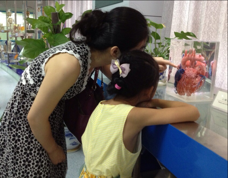 当天早上,教职工和子女们兴致勃勃地来到医学标本馆的所在地——北校区医学科技综合楼三楼,跟随专业老师的引领,先后参观了馆内的人体解剖学、人体组织胚胎学、人体病理学和人体寄生虫学4个标本展区,体验了一场丰富的人体探秘之旅。讲解老师根据展出的标本内容,用深入浅出的语言,向大家阐释了人类从胚胎的发生、孕育、分娩、成长、疾病、衰老到死亡的生命过程,耐心细致地回答孩子们在参观过程中产生的疑问,还穿插讲述了生活中的急救常识等医学知识。馆内的展示墙面上设有电子屏幕,滚动播放与人体构造有关的医学知识短片,与标本相结合,更加直观地普及了生命、健康知识。讲解结束后的自由参观环节,家长和孩子们投入到共同的学习中,有的带着孩子继续近距离观察和讨论感兴趣的标本,有的和孩子一起使用显微镜观看标本切片,还有的鼓励孩子动手组装起人体模型。医学标本馆虽然不大,但参观活动一直持续了超过1个半小时,绝大部分的教职工都是带着子女从校外专程赶来。家长们普遍认为,活动为孩子们提供了增长科普知识、拓宽学习视野的第二课堂,同时寓教于乐、融入亲子互动,既有趣味又很有意义。