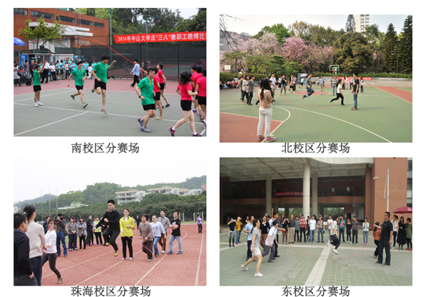 比赛现场一片欢腾,整齐的跳跃,嘹亮的口号,飞快的绳子,围观群众都不由自主地呐喊、加油。经激烈角逐,珠海校区的附属五院工会夺得短绳和长绳项目的双料冠军;东校区的短绳和长绳项目冠军分别由药学院分工会和机关分工会夺得;北校区的短绳和长绳项目冠军分别由中山眼科中心工会和附属第六医院工会夺得;南校区的短绳和长绳项目冠军分别由高等继续教育学院直属部门工会和后勤集团分工会夺得。本次活动得到各单位的大力支持同时深受教职工的喜爱,校工会向所有参与活动的教职工表示由衷的感谢!