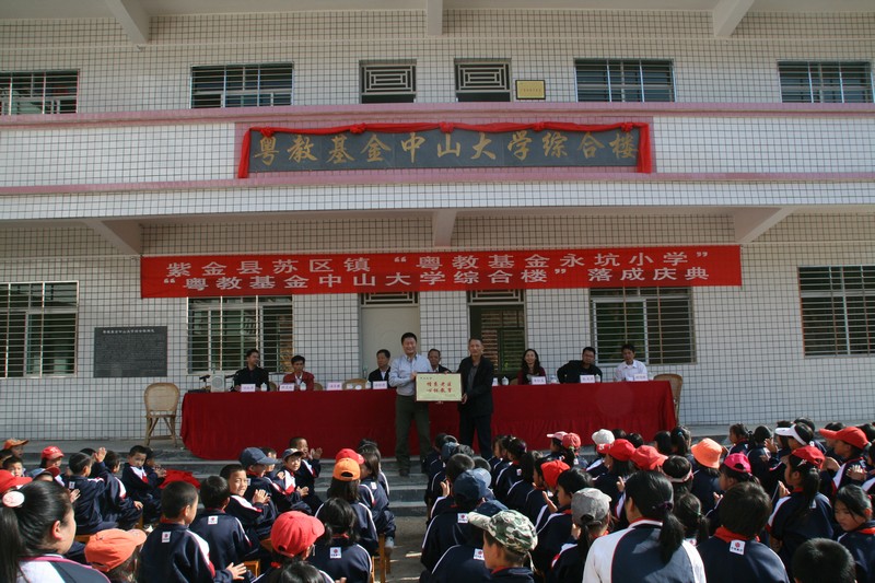 11月11日下午,由我校师生员工捐资15万元、广东省教育基金会捐资10万元建设的"粤教基金yl23455永利集团综合楼"落成庆典仪式在河源市紫金县苏区镇永坑小学举行。我校工会专职副主席彭志刚、广东省教育基金会副秘书长余潮波、许怀升、紫金县教育局、苏区镇的有关领导及永坑小学全体师生共200多人参加了庆典仪式。