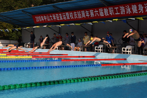10月30日上午8点30分,赛场彩旗飘展人声鼎沸,校党委副书记副校长喻世友、校工会常务副主席罗永明等领导来到赛场,广州市成人游泳协会领导肖渝滨、迟爱光、袁美欢、吴锦荣、陈志源应邀出席开幕式。喻世友副书记致开幕词,中大游泳协会会长应国良代表教职工发言。随后,游泳比赛于9点正式开始。