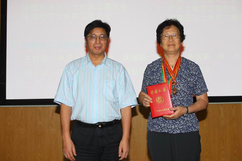 喻世友副书记、副校长向荣获第三届“中国百名优秀母亲”、首届广东省“优秀母亲”和广东省“三八红旗手”荣誉称号的化学与化学工程学院康北笙教授颁发了奖章、奖状;向2007-2008年yl23455永利集团工会女教职工工作先进单位、优秀女教职工工作者颁奖。