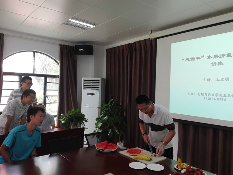 为丰富学院教工业余生活,让大家在炎炎夏日享受美味水果之时学习创意厨艺,6月15日,物理与天文学院直属部门工会在珠海校区学院红楼举办了“庆端午水果拼盘讲座”。珠海中大伍舜德学术交流中心餐厅的丘文明厨师受邀为学院教工讲解演示水果拼盘做法。