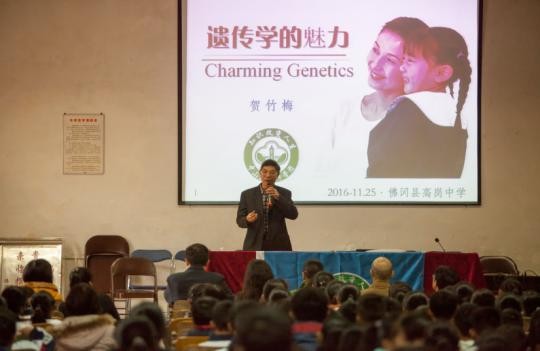 在高岗中学,生命科学学院贺竹梅教授和附属肿瘤医院赵明教授分别作了题为 “遗传学的魅力”及 “知识改变命运--从学医到认识肿瘤、治疗肿瘤”的讲座。贺竹梅教授用大量精彩的遗传学图片和生动的示例,为中学生们打开了遗传学的大门,为学生们传授了许多神奇奥妙的遗传学知识。赵明教授则以自己成长的故事,激励学生树立远大理想,努力成才;同时还生动讲解了肿瘤学的相关基础常识,展示了肿瘤症状和临床治疗过程。