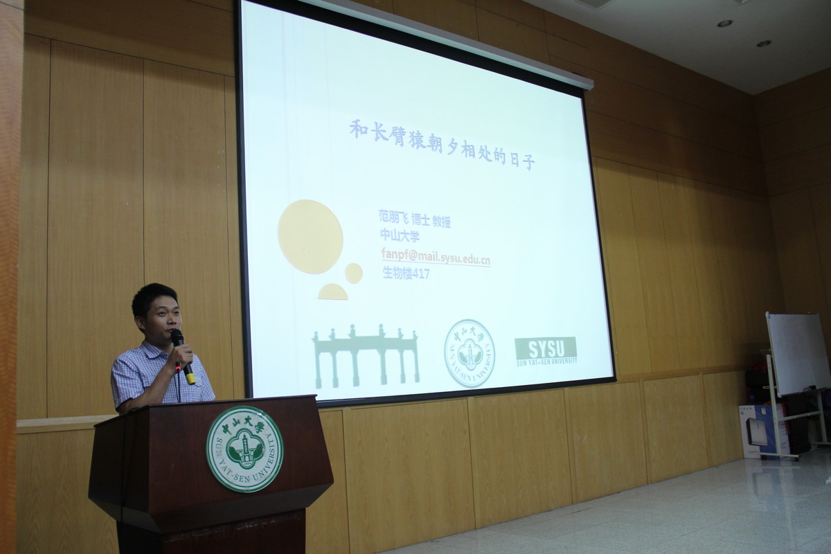随后,范朋飞教授作了题目为《和长臂猿朝夕相处的日子》的演讲,范老师专注于灵长类研究和保护十余年,在艰苦的环境和挫折中不断的前行。范教授讲述了研究过程中长臂猿的毛色变化、自我意识、捕食、鸣叫以及婚配制度等一系列生活习性,娓娓道来,通俗幽默,专业性与科普性并存。
