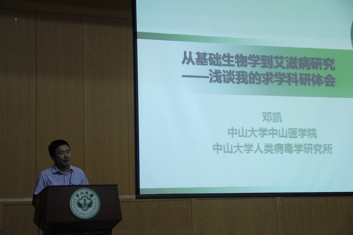 接下来,中山医学院邓凯教授进行了以《从基础生物学到艾滋病研究-浅谈我的求学科研体会》为题的演讲。邓教授以故事的形式讲述了其在美国求学的经历,邓教授认为科研是一个漫长的过程,需要具备坚韧不拔的毅力以及不惧失败的坚强内心。因此科研人员更应重视各方面的能力培养,要有理想有情怀,注重逻辑训练,同时也要重视体育运动。