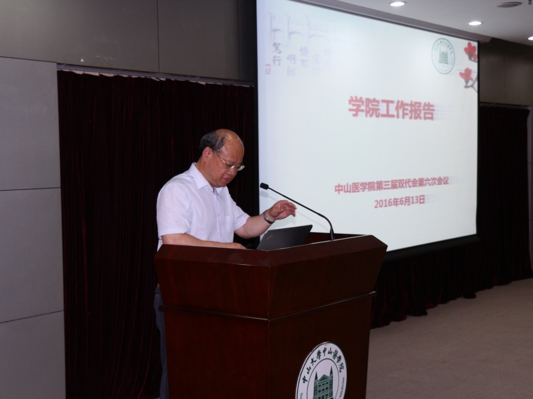 首先,中山医学院党委书记吴忠道教授作了《学院工作报告》,报告指出:在全院师生的共同努力下,中山医学院较好地完成了“十二五规划”中的各项目标与指标任务,在人才队伍建设、人才培养、科学研究、国际合作与交流、社会服务等方面均取得显著的成效。中山医学院根据学校“文理医工各具特色融合发展,具有广泛国际影响的世界一流大学”的总体发展战略目标,以及“进入国内高校的第一方阵”的现阶段发展目标,制订了中山医学院“十三五”规划,并制订了学院“十三五”期间及近十年的总体奋斗目标。依据“一流学院、一流学科、一流平台”的定位和建设理念,按照“高原高峰并重、体量质量并举”的总体思路,面向国际前沿、采用建设“大平台、大团队、大项目”的工作方法,实现整体学术水平的跨越式提升和超常规发展。