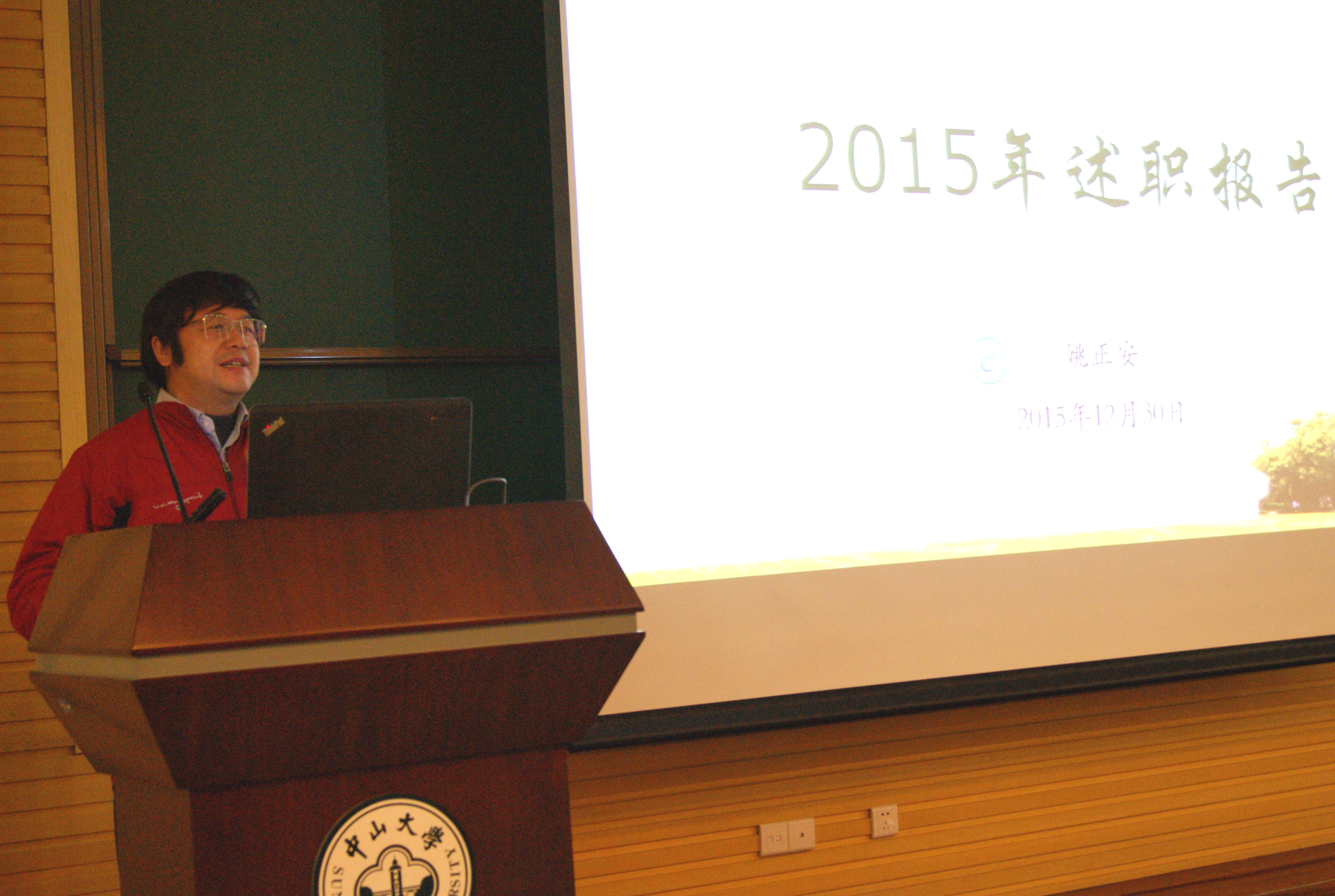 首先,姚正安院长作2015年数计学院工作总结报告,回顾过去一年学院的大事,汇报了学院 “十二五”规划的完成情况和制定“十三五”规划等情况。姚院长从学科建设、科研项目、教学培养、合作交流、工会、行政和社会服务等方面展开,具体介绍了学院在师资队伍建设、人才项目、科研、本科教学、合作项目、广东省数学会事务等方面的工作情况及取得的成绩。