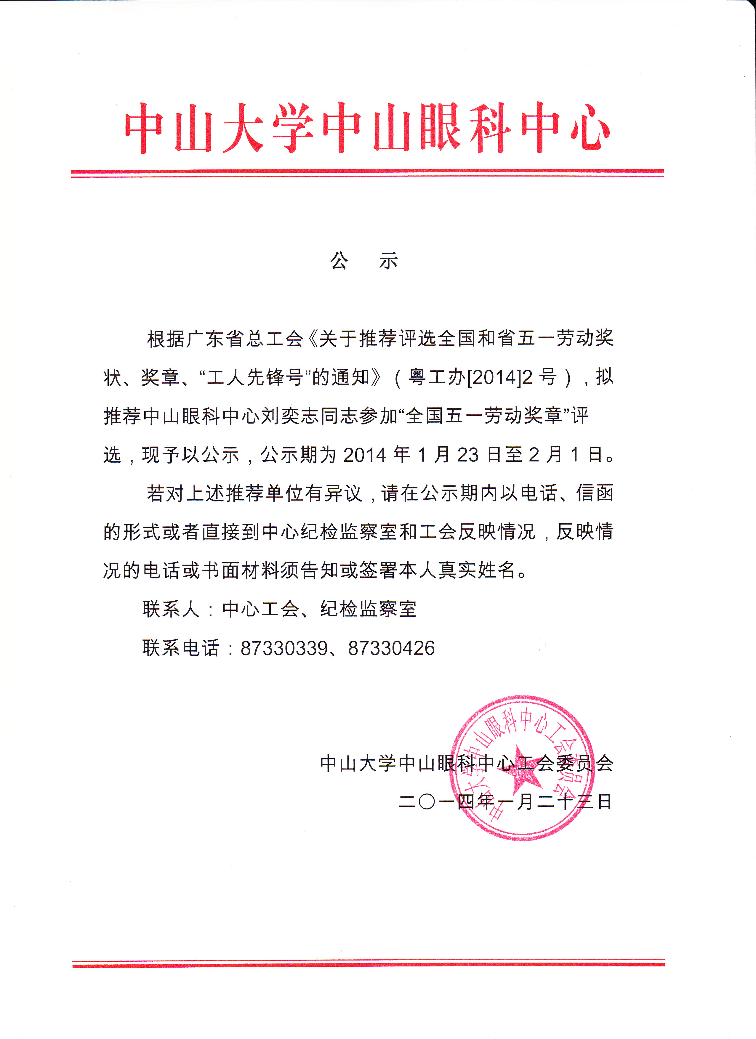 导航痕迹 首页 基层工会 二级工会活动 关于中山眼科中心推荐刘奕志参加“全国五一劳动奖章”评选的公示 关于中山眼科中心推荐刘奕志参加“全国五一劳动奖章”评选的公示 发布日期:2014-01-23 14 Share