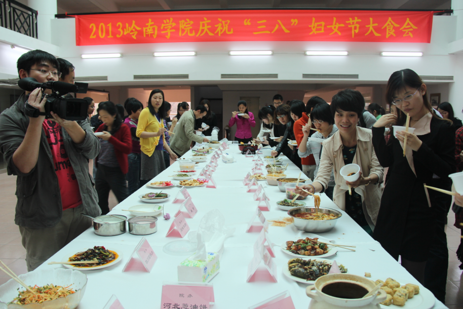 3月7日下午,岭南学院分工会为庆祝“三?八”国际妇女节组织学院教职工举办了“大食会”活动。活动现场摆满由学院女教职工们事先亲手制作的30多种菜品,琳琅满目、色香味俱全。工会主席卓鸥老师宣布“开吃喽!”,众多教职工欢聚在一起,热热闹闹地吃起了自己做的美味佳肴。同时,院工会还请荣光堂在现场准备了饺子馅和面粉,让有兴趣的教职工参与包饺子活动。教职工们有的和面、有的擀皮、有的包饺子,有说有笑,其乐融融。欢笑声此起彼伏,现场弥漫着温暖的气息。活动最后,现场教职工评选出“十大最受欢迎菜品”。学院工会通过组织大食会展现出学院女教职工的美好创意和生活情趣,也增加了教职工的沟通和交流机会,让大家在繁忙的工作之余拥有一份轻松和愉悦。