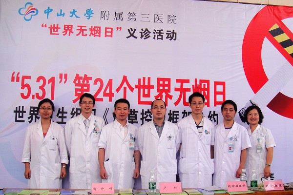 根据“全国无烟医院”的要求,附属三院己从2010年初实行全面禁烟,目前是广东省25家全国无烟医院之一。作为医务工作者,首先要做不吸烟的表率,从而带动全社会更多的人告别烟草,享受健康。此次义诊,三院人用实际行动表达了控烟的决心与态度。