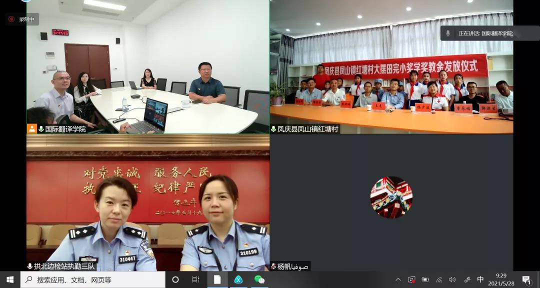 “六一”国际儿童节前夕,国际翻译学院和珠海市拱北边检站执勤三队为我校定点帮扶点云南省凤庆县红塘村大摆田完全小学举行了爱心奖学金发放仪式。学院党委书记王琤、第二教师支部书记陈杰,拱北边检站执勤三队党总支书记刘心月、副队长邹璐及双方单位职工代表通过线上方式“云端”相聚。凤庆县人民政府副县长王克、县教体局党委副书记段世冰、县红十字会长杨少波等有关领导、嘉宾应邀现场出席活动。
