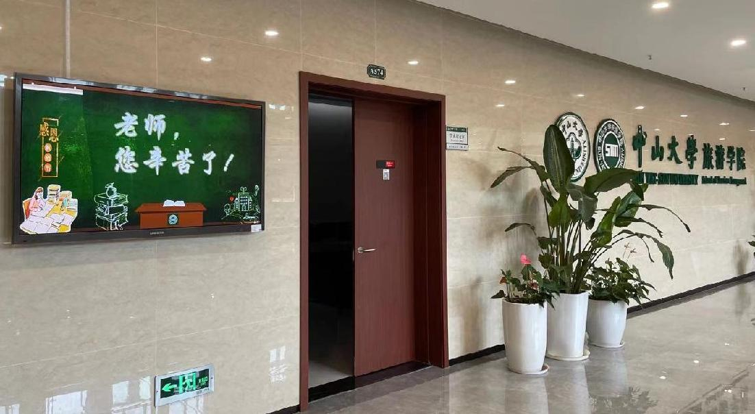 春风化雨凭栏意,莫叫情恩任东西。走进旅游学院,随处可见浓厚的节日氛围,楼道里的公共电子显示屏不间断地发送出教师节祝福语。一句句温暖的问候与祝福,“老师,您辛苦了”“教师节快乐”等暖心语句不断滚动,真诚的祝福让老师感到无比贴心,同时也号召同学们感念师恩、礼敬教师。